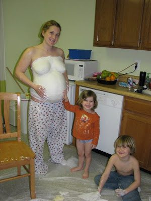 Tonight we all made the belly cast for this pregnancy. This time, I ordered a real kit from http://www.pregnancybellycastkit.com/index.html and it was soooo much better than the paper mache we used for Lilli’s! It was easier, dried faster, and just looks so much nicer. The kids had fun helping, too.