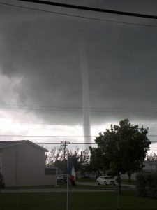 It was right in front of us, maybe a mile away. I don’t remember the last time I was so physically scared. I didn’t even know what I was seeing at first, I swear it looked like a jet had just flown through the clouds and separated them, like a cartoon; there was this clear path through the clouds. I followed the path, thinking wow what a weird jet line, noticing the path turned grayish below the cloud. Then I noticed the curvature of it…then I realized…holy shit…that’s a tornado. One of my nightmares come true. Seriously, my nightmares are all tornadoes, alligators, and suddenly being back in school taking a test realizing I haven’t come to class all year because well honestly I haven’t been in school for years LOL. I told the kids what I saw, probably in some scary non-swear expletive form, u-turned, and sped back down the road. We were flying, like 50mph on our little 15mph street. Some lady gave me a dirty look. Obviously she hadn’t looked down the road yet!! I had no idea what way it was going and I certainly didn’t want to be in the car if it was headed at us! The kids were scared, they were asking if tornadoes pick things up and tear of roofs…I wasn’t really sure how to answer, because I didn’t want to scare them with the truth nor did I want to lie to them, either. I just told them when we got to the house to get out of the car as fast as they could. I had them close the bedroom doors while I grabbed the weather radio and a comfortor (I couldn’t have fit the recommended mattress in the bathroom lol) and we huddled in the shower. We were really, really scared. We listened to the NOAA weather warnings about the water spout heading to land in Key West, and I was really wishing I had a map in the bathroom because Key West sits at a funny angle and I wasn’t 100% sure where it was according to what they said. The said it was headed south, which I was fairly certain meant it was going away from us, thank G-d. Every thunder rumble made me nervous. I’ve always heard a tornado sounds like a train, but I wasn’t really sure if that meant it was like thunder too LOL. After about 10 or 15 minutes they lifted the warning. The spout hit land at the Coast Guard station and dissipated as it crossed land, as you can see in the pictures.