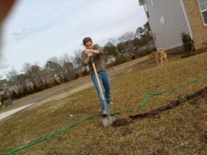First, on a nice tease of a nice day, I mapped out in the front yard where we wanted to make a bed, and dug a border around it.