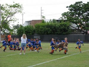 Well, not exactly singing…but playing football and cheering! Today was the first day the girls FINALLY had full uniforms, and boy did they look cute! And Lilli finally remembered to look forward during cheers after critiquing herself in the videos I uploaded yesterday. The game started off great, Gators leading the Seminoles. It POURED for most of the game. Lots of wet children (and Mickade crying at one point). It was 22-16, then 30-16, with literally seconds to go. Awesome, a big win, finally!!! Wrong. That all changed in the last 60 seconds of the 4th quarter…it was tied 28…then we scored, missing the conversion, making it 34-28. The Noles (yes, the SEMINOLES, can you believe it? On my birthday???) tied it again, and with 9 seconds on the clock, got their 2 point conversion. The Gators gave it their all and managed 2 more plays those last 9 seconds, but gave the Seminoles their first win of the season, 34-36.