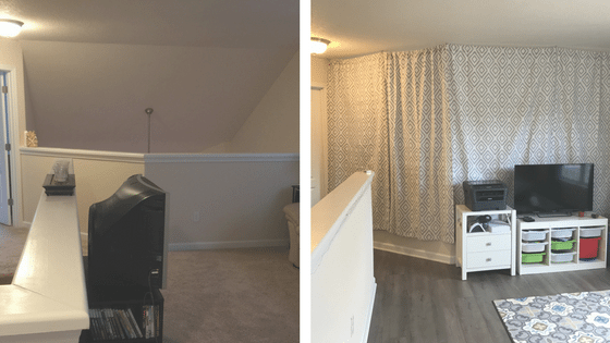 When we redid the floors, replacing the carpet with laminate, the noise issue got worse…lots of echoes with all that open space and hard surface! I would absolutely love to have the area professionally closed in but well…that’s not exactly in the budget!